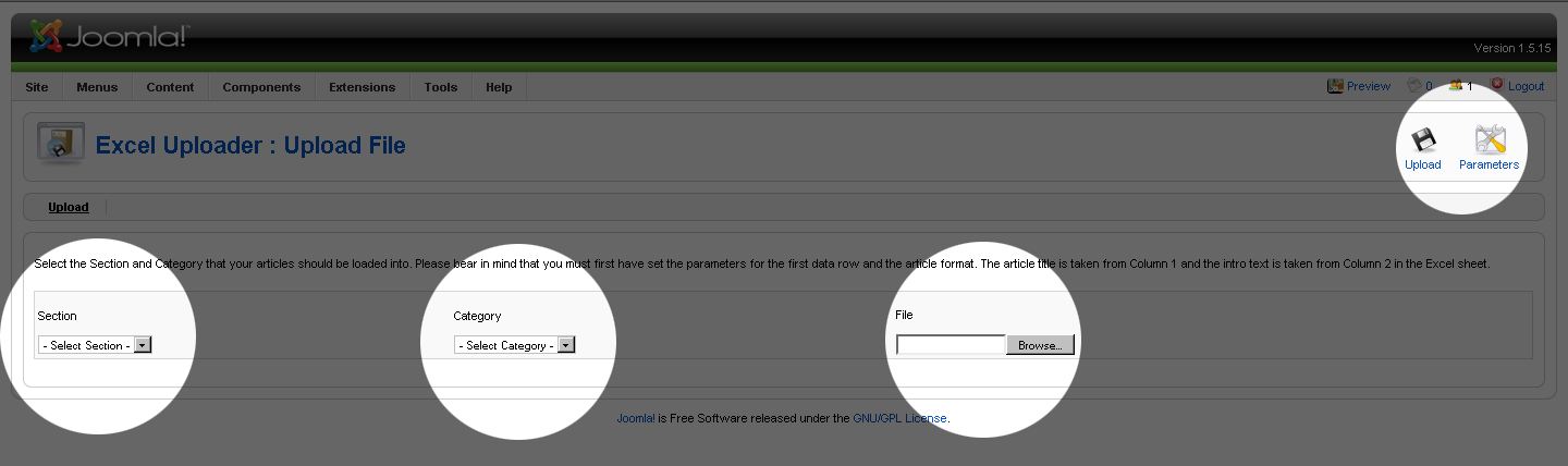Now that the Excel Uploader is in MVC form it should be able to better handle future versions of Joomla. We have also removed the configuration view and replaced it with parameters. In order to keep things simple we also decided to remove the "Title Format" parameter and change the way that the "Intro Text" is constructed. The titles for articles are now taken from Column 1 and the intro texts are taken from Column 2 in the Excel workbook. They can still, however, both be used in the main body of the article using the placeholders {1} and {2} as before. We hope you will agree that this is a simpler setup than before.