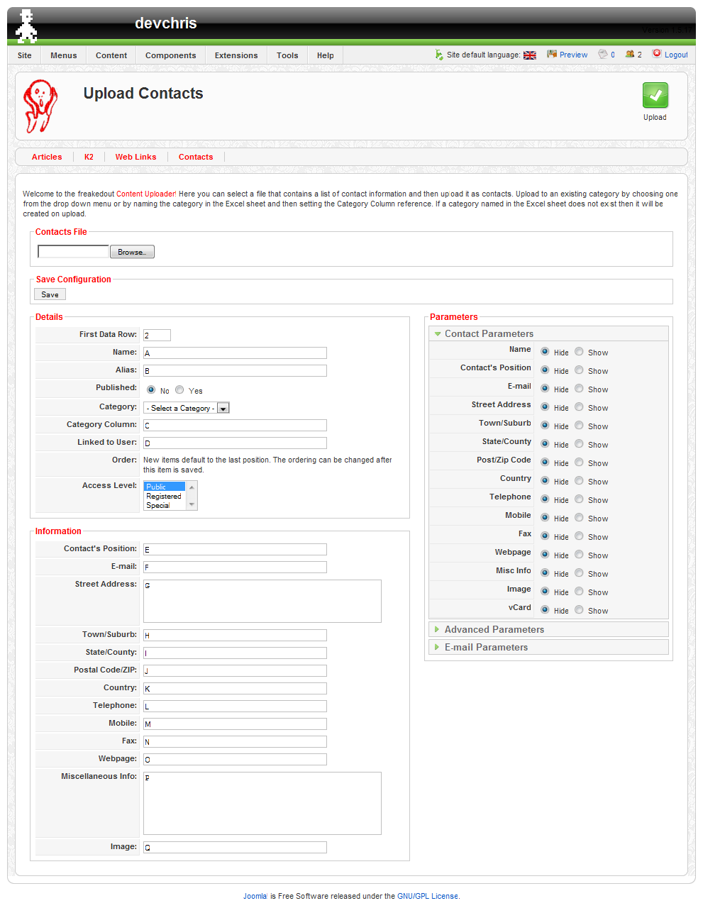 Another fast major update to one of our most popular Joomla! extensions, the Content Uploader Pro. The ability to upload contacts. In the traditional way you would have to open and save a form for each person you would like to add to your contacts section on your Joomla! website. Undoubtedly you shouldn't start a project without this tool.