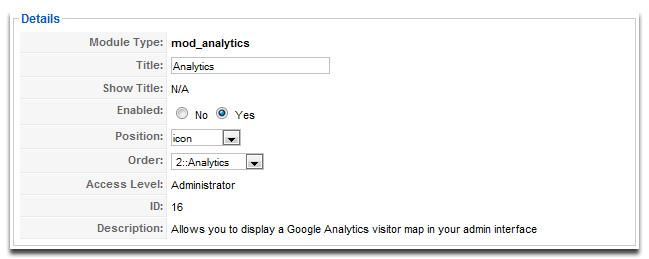 Now that the module is installed you will see it in the Administrator part of the Modules list. Open it up and set it to display in the "icon" position. This position is located on the "Control Panel" of the Joomla administrator interface.