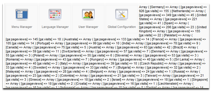 And that's it! You should now have a fully functional visitor map that works in the administrator section of your Joomla! website. To create an install package simply download the files into the same directory you started with on your local machine and zip the folder. Don't forget to download the lib folder with the google analytics class!