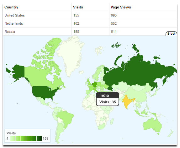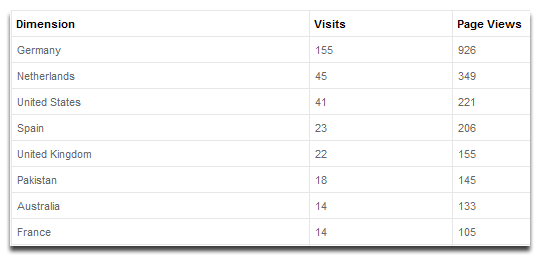 We now have our visits and page views per country displayed in a table. The $map variable is used to construct javascript that we will need to display our data on a map of the world. Google provides a handy charts API that allows us to do this. The documentation for the geo map chart that we are going to use can be found here.