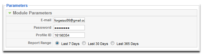 Now when we go to edit our module we will see three text boxes that we can use to enter the analytics username, password and profile id. There will also be a radio button select list where the user can select to view reports over 7, 30 or 365 days.